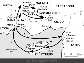 [[파일:03_FB_BJ_Paul_Maps_KO.png|thumb| | [[파일:03_FB_BJ_Paul_Maps_KO.png|thumb|351px|바울 1차 선교 여행 경로 (행 13-14장)]] | ||