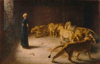 (단 6장) 다리오 왕이 고관 백이십 명을 세워 통치하게 하고 또 그들 위에 총리 셋을 두었는데 다니엘이 그중의 하나였고 총명하여 왕이 그를 세워 전국을 다스리고자 하였습니다. 이에 다른 총리와 고관들이 다니엘을 모함하려 했으나 흠을 찾을 수 없어 하나님의 율법에 근거를 찾아 고발하고자 하였습니다. 그래서 왕에게 한 달 동안 왕 외에 어떤 신에게도라도 기도하면 사자 굴에 던진다는 금령을 내릴것을 원했고 왕이 도장을 찍어 주었습니다. 다니엘은 언제나처럼 하루 세 번 예루살렘을 향해 기도하였더니 곧 고발을 당하였고 왕은 고칠 수 없는 규례라 하였으므로 근심하였습니다. 다니엘이 사자 굴에 들어간 날 밤 금식하던 왕이 다음 날 다니엘을 찾아가 부르니 다니엘이 살아있기에 왕이 여호와를 찬양하였습니다. 그리고 화가 난 왕이 고발한 자들을 사자 굴에 던지라 명령하고 하나님을 경외하라는 조서를 내렸습니다.